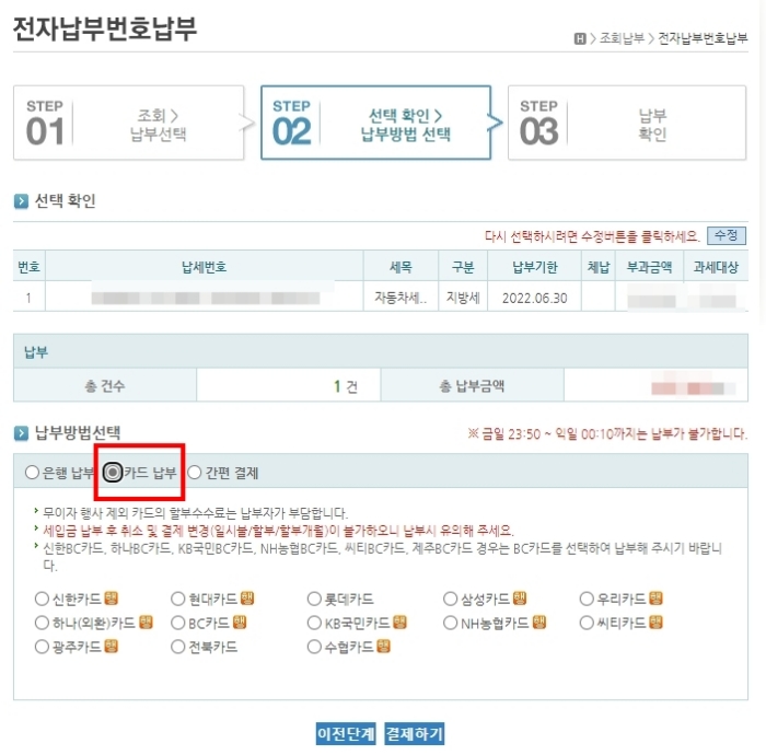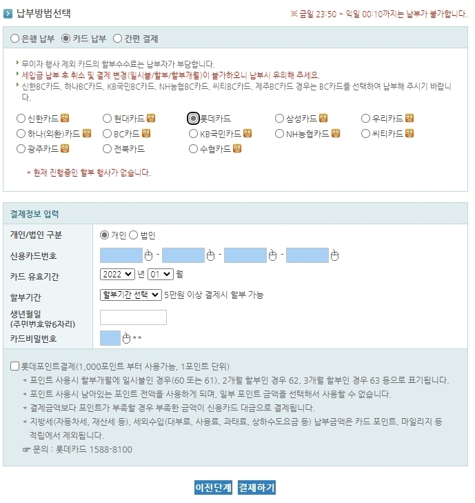 4.은행 납부, 카드 납부, 간편 결제 등의 납부 방법 선택 옵션 중 "카드 납부" 클릭 후 카드 결제 정보 입력.