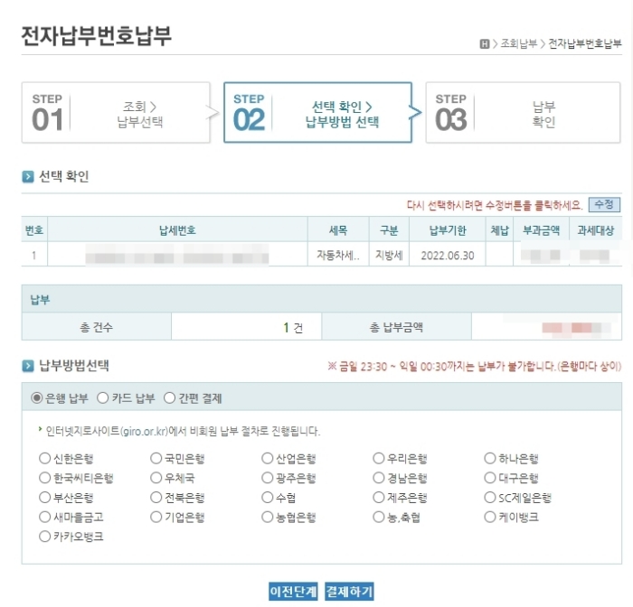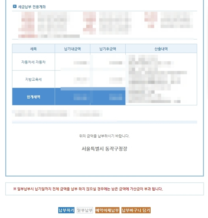 3. 자동차세 내역 하단에 있는 "납부하기" 버튼 클릭.