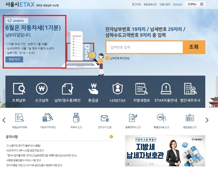 1. 서울시 이택스 홈페이지에 접속하면 보이는 자동차세 납부 알리미 안내의 바로가기 클릭.