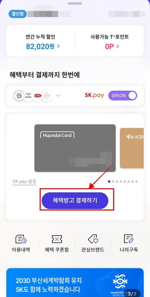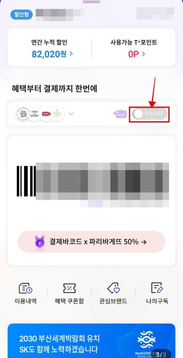 그동안 티멤버십 제휴 사업장에서 할인 혜택을 쏠쏠하게 챙겨왔는데 새로 런칭한 티멤버십 결제바코드를 이용하면 훨씬 큰 할인률을 제공해준다고 한다.