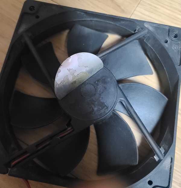 위 사진에 보이는 볼트 4개를 풀어서 케이스 팬을 분리해보니 엄청나게 묵은 먼지 때들이 보였음.
